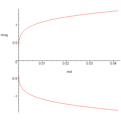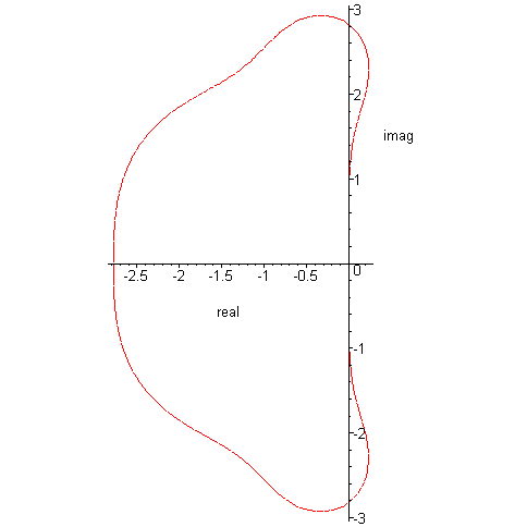 Curve intersects the negative real axis at -2.7853 (approximately). And the imaginary axis at (plus or minus) 2.8284i (approximately).